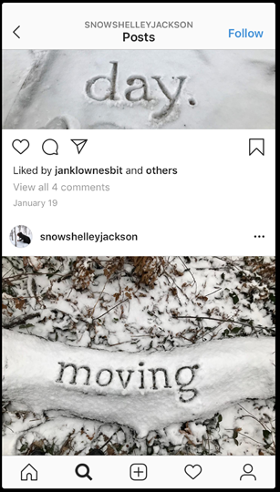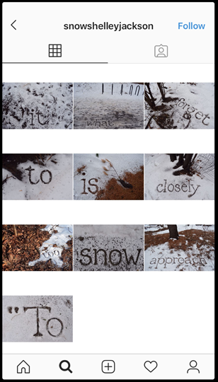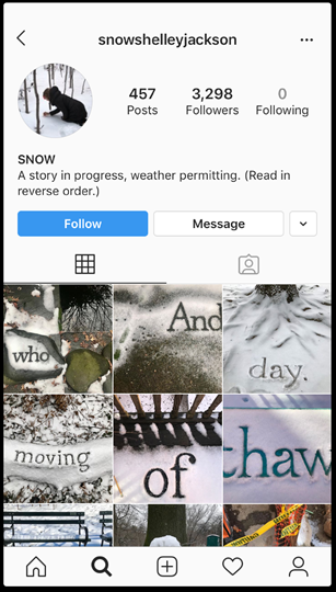 Some things Jackson does not do: filters, multi-image posts, stories, videos, captions, hashtags, and various other formal and social affordances of the platform. This is not exhaustive of Instagram, but it does make distinct use of it and the general aesthetic sensibilities of its userbase. Snow will not be to everyone's taste, but this other instance of infinite possibility is worth considering with regards to the question, "Can literature exist on Instagram?"